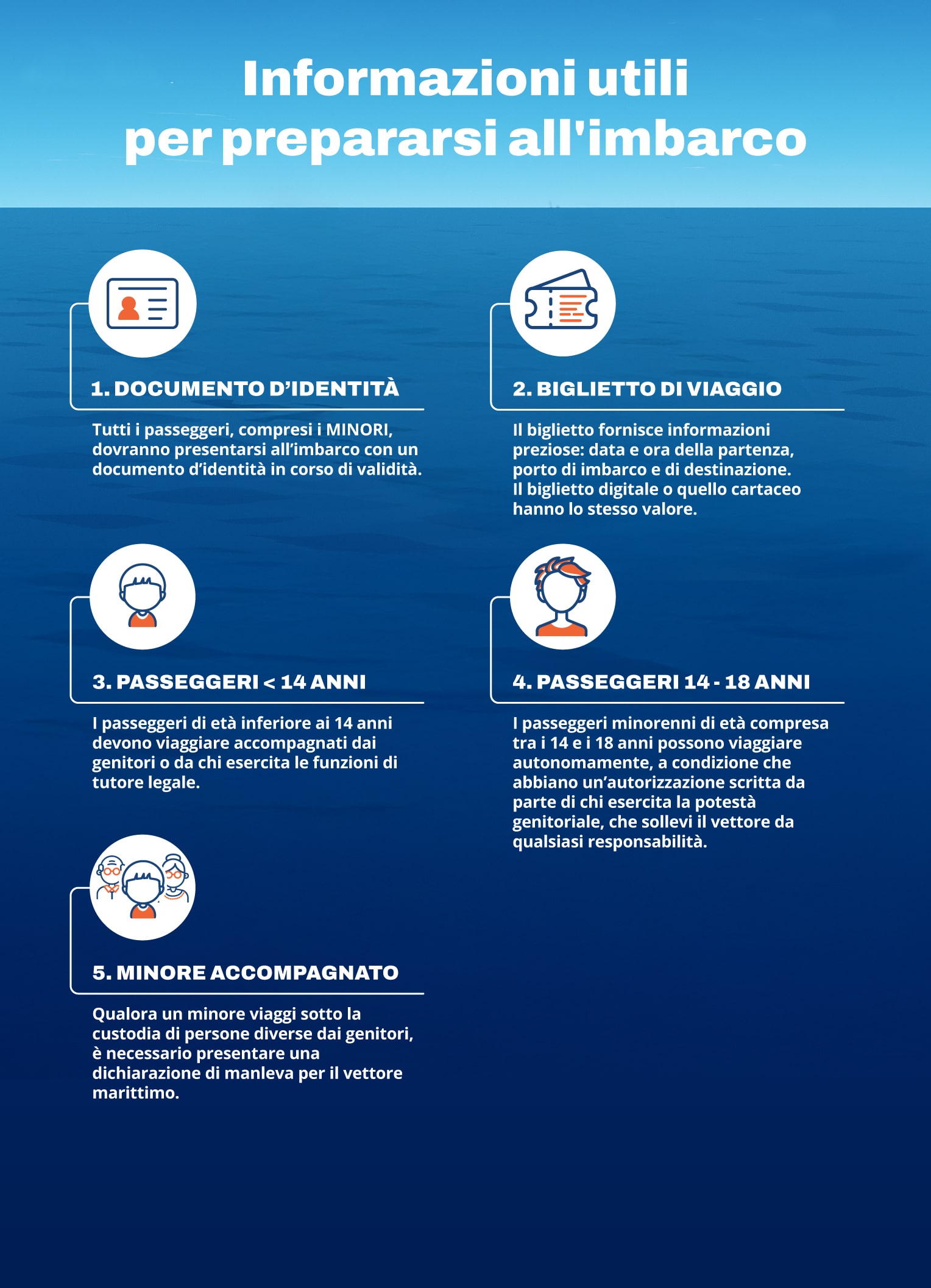 In ottemperanza alle normative in tema di Security ed alla Circolare Serie Generale n. 106 del Ministero delle Infrastrutture e dei Trasporti in tema di Sicurezza della Navigazione, al momento dell'imbarco il cliente dovrà esibire unitamente al biglietto anche un documento di identità, in originale, in corso di validità di tutti i passeggeri ivi compresi i MINORI. La mancata esibizione dei documenti di identità comporterà il diniego all'imbarco.