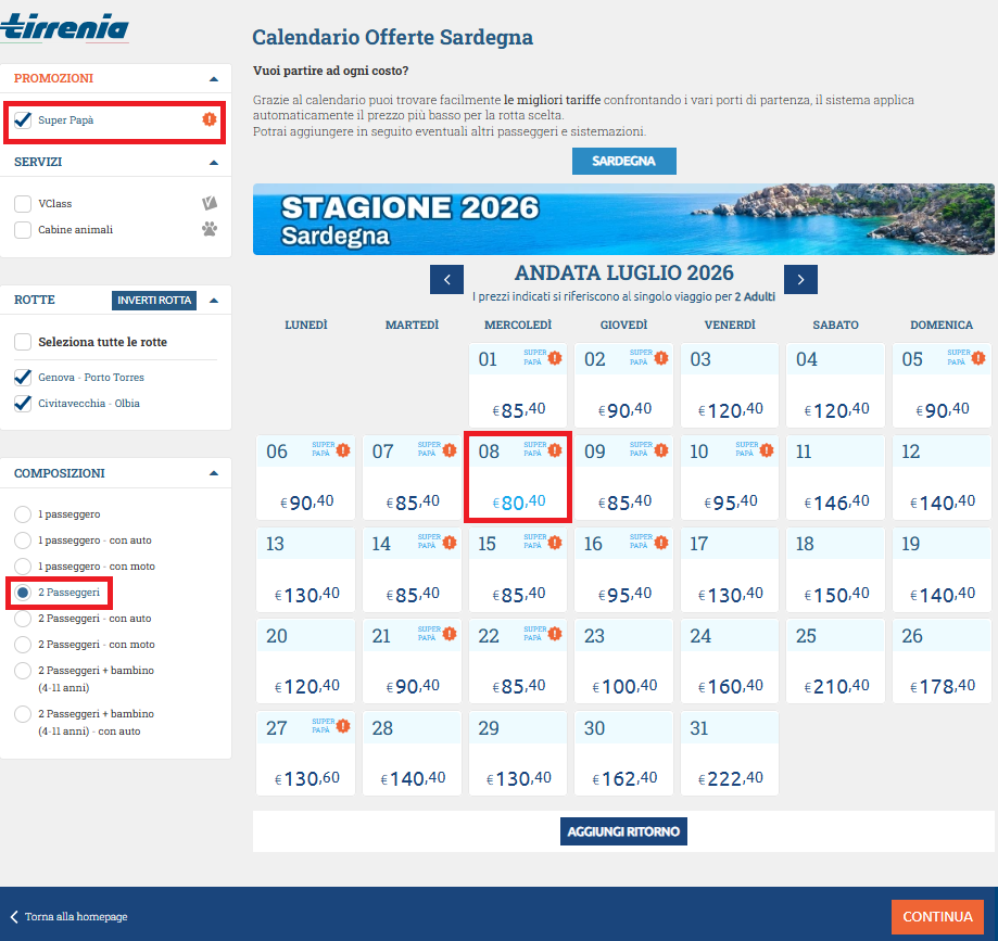 • La prenotazione dovrà essere effettuata dal 16/03/2026 al 19/03/2026 per partenze Tirrenia, Genova-Porto Torres-Genova e Civitavecchia-Olbia-Civitavecchia dal 01/06/2026 al 30/09/2026;