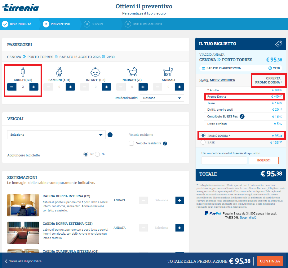 Durante il percorso di prenotazione la promozione, se applicata, sarà visibile nel pannello di riepilogo prenotazione nella parte destra della pagina.